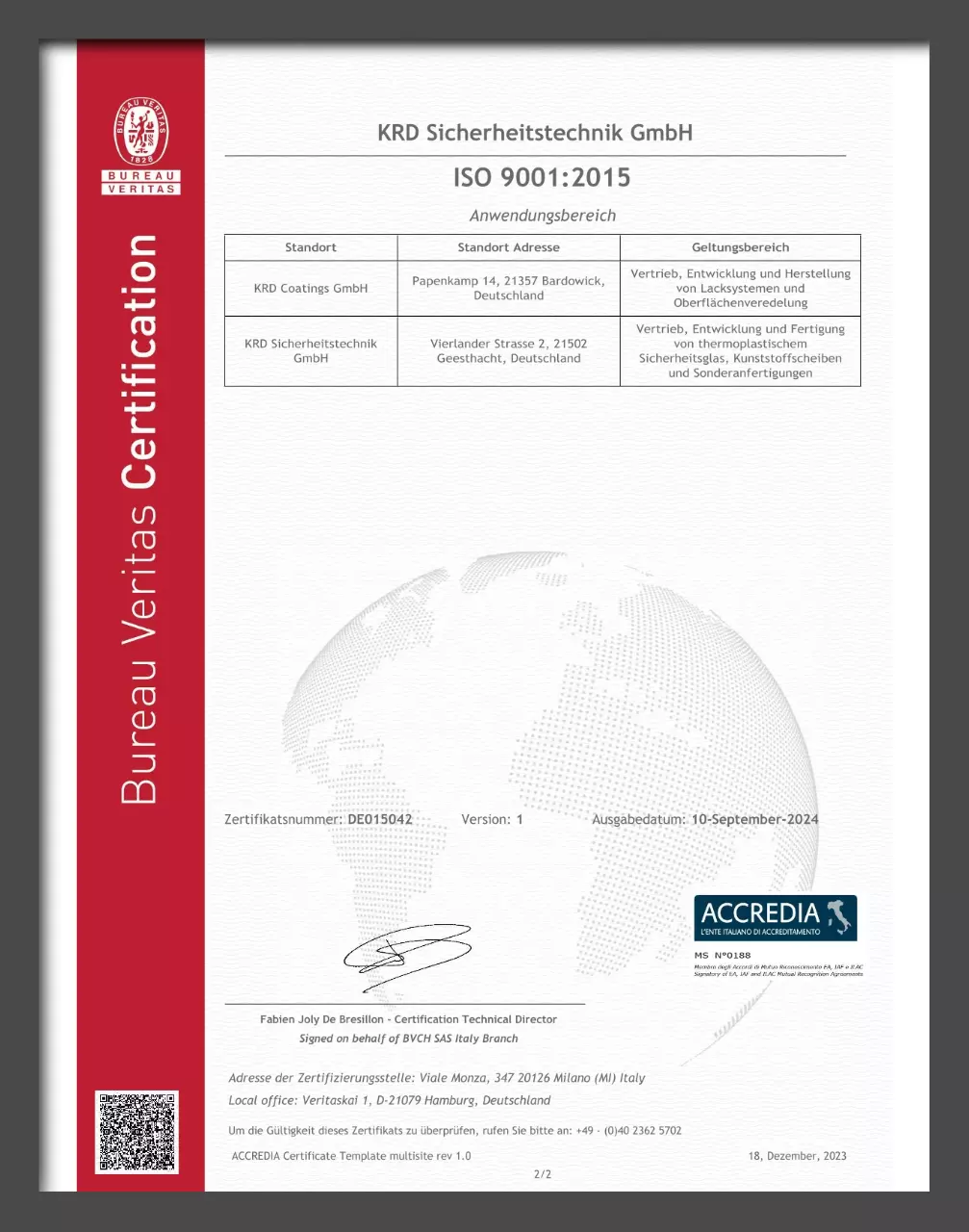 QM Zertifikat nach DIN EN ISO 9001:2015 für die Sicherheitstechnik